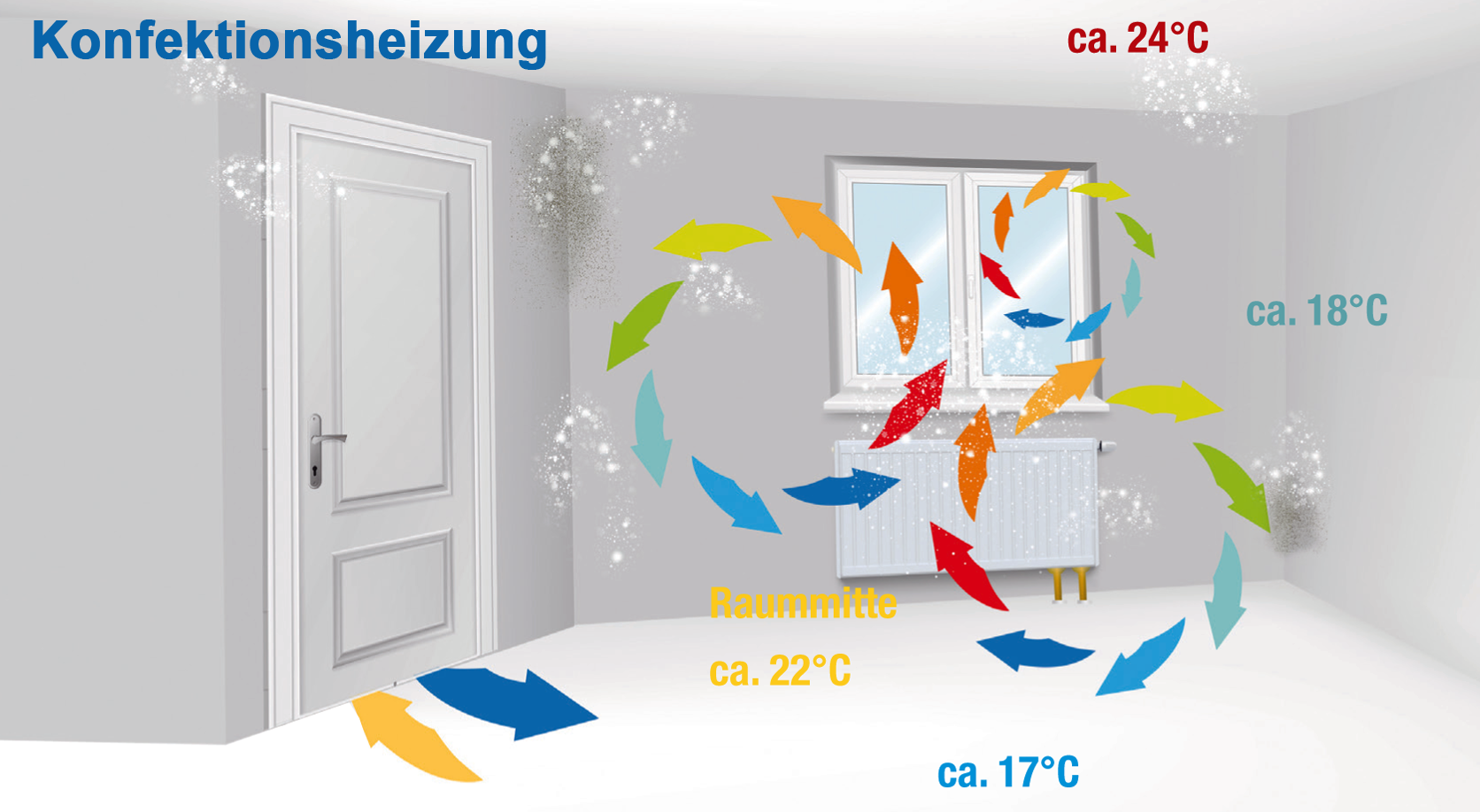 Bei herkömmlichen Heizungen wird die Raumluft erwärmt, somit herrscht keine stetige Temperatur im Raum. Die warme Luft steigt zur Decke, kühlt dort ab, fällt an der Wand nach unten und kehrt abgekühlt über den Boden zurück zum Heizkörper. Staub wird dadurch im Raum aufgewirbelt und Feuchtigkeit dringt in die kühleren Wände ein, sodass Schimmel entstehen kann.